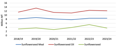Прогнозируется, что мировое производство семян подсолнечника в 2023/24 году увеличится на 6 процентов по сравнению с предыдущим годом до 54,3 миллиона тонн. Рынок по-прежнему находится под влиянием вторжения в Украину, и, по прогнозам, ЕС и Россия получат в ответ рекордные урожаи. Другие области роста производства включают Казахстан и Аргентину. Прогнозируется, что производство семян подсолнечника в Украине немного восстановится по сравнению с 2022/23 годом, поскольку фермеры заменяют посевные площади зерновыми в пользу масличных культур; однако урожай останется значительно ниже доконфликтного уровня. В этом году Россия остается крупнейшим в мире производителем семян подсолнечника, обогнав Украину в сезоне 2022/23.