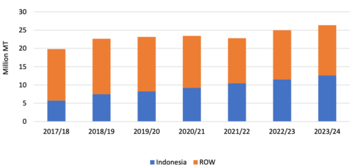 Мировое производство пальмового масла в 2023–2024 годах увеличится благодаря прогнозируемому расширению площадей и возвращению к тенденции урожайности в Малайзии и Индонезии. Ожидается, что в 2023–2024 годах глобальное использование пальмового масла для пищевых и промышленных целей увеличится как за счет роста населения, так и за счет экономического роста.