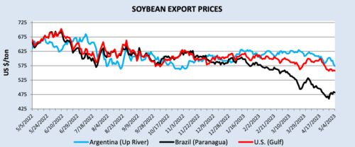 Цены на сою продолжали падать со времени последнего отчета WASDE, поскольку Бразилия и Аргентина собирают урожай 2023 года. Средняя цена в Аргентине упала больше всего, вероятно, отражая приток бразильских соевых бобов на мировой рынок и сдержанную реакцию на самую последнюю итерацию программы «соевый доллар». Ожидание высоких поставок сои привело к снижению мировых цен на соевый шрот и соевое масло. Пальмовое масло изменило курс по отношению к соевому маслу. Цены на пальмовое масло, торгующиеся с небольшой премией по сравнению с соевым маслом в Южной Америке, поддерживались снижением производства в Малайзии и медленными продажами в Индонезии.