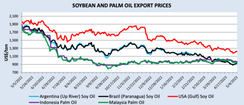 Апрель 2023 г. Экспортные цены на соевые бобы и пальмовое масло