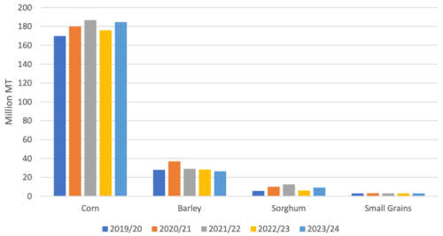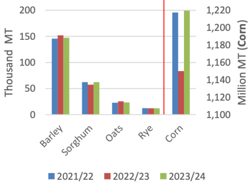 Согласно прогнозам, мировое производство фуражного зерна увеличится, так как сильный рост производства кукурузы и сорго более чем компенсирует снижение производства ячменя, овса и ржи. Прогнозируется, что производство фуражного зерна в США, Китае, Европейском союзе, Бразилии и Аргентине будет выше, чем компенсирует более низкие урожаи в Украине, Австралии и Канаде. Ожидается, что мировое потребление фуражного зерна будет умеренно расти с 2022/23 года, поскольку ожидания снижения цен на кукурузу и сорго поддерживают рост мирового спроса, более чем компенсируя более слабый спрос на ячмень, овес и рожь.