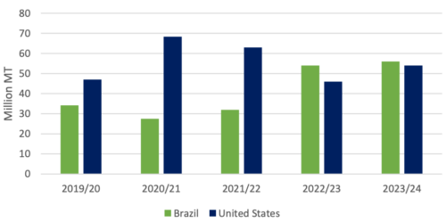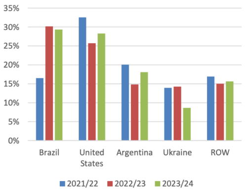 Прогноз производства бразильской кукурузы на 2,0 млн тонн выше пересмотренной оценки на 2022/23 год до 56,0 млн благодаря продолжающемуся расширению производства и конкурентоспособным ценам. Ожидается, что поставки из safrinha 2023 и 2024 годов (если они будут реализованы) будут способствовать высокому экспорту в начале и конце 2023/24 года соответственно. Бразилия начинает с прогноза экспорта выше, чем у США.