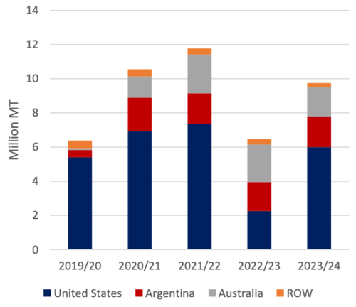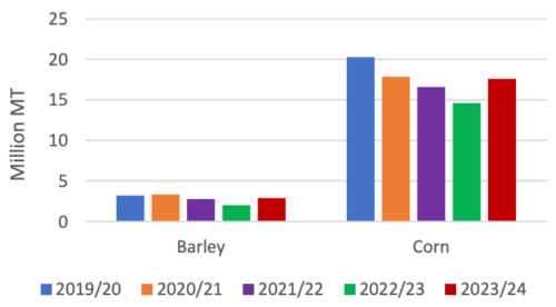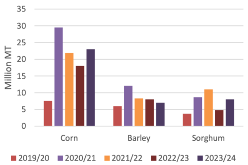 Прогнозируется увеличение импорта кукурузы в 2023/24 году благодаря доступу к обильным и конкурентоспособным по цене запасам кукурузы из Бразилии, в дополнение к поставкам из США и Украины. Китай зафиксировал значительный импорт кукурузы из Бразилии, начиная с января 2023 года. Поскольку в 2023 году ожидается обильный сафринья, часть этих поставок будет экспортирована в 2023/24 году. Прогнозируется, что импорт ячменя снизится по сравнению с пересмотренной оценкой на 2022/23 год. Импорт сорго также будет расти, в первую очередь отражая восстановление производства и экспортных поставок в США, что более чем компенсирует снижение экспорта сорго из Австралии.