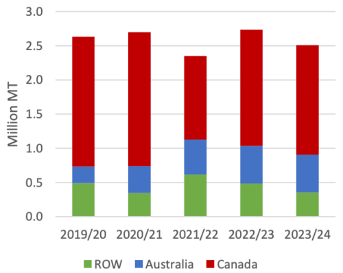 Австралийский ячмень снизился на 2,5 млн тонн до 5,5 млн из-за меньшего урожая. В последние годы наблюдается высокий спрос на импорт австралийского ячменя из Восточной Азии и Ближнего Востока в качестве доступного фуражного зерна, но достаточные мировые запасы кукурузы и сокращение производства, вероятно, повысят цены, снизив экспортный спрос в 2023/24 году.