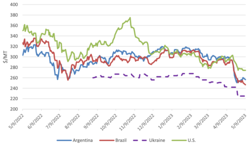 После апрельского отчета WASDE предложения всех основных экспортеров существенно снизились. Ожидания значительного увеличения добычи нефти в Бразилии оказывают давление на цены во всем мире. Заявки США упали на 16 долларов за тонну до 274 долларов; слабые обязательства перед основными торговыми партнерами и крупные отмены поставок кукурузы в Китай свидетельствуют о снижении спроса на кукурузу в США. Заявки Бразилии снизились на 38 долларов за тонну до 246 долларов из-за потенциального рекордного урожая. Благоприятные условия и значительное расширение площадей в центрально-западной и южной частях Бразилии повышают ожидания в отношении предстоящей safrinha. Заявки Аргентины резко снизились на 40 долларов за тонну до 256 долларов. Слабый спрос со стороны основных партнеров и понижательное давление со стороны большого бразильского урожая резко снижают цены, несмотря на дефицит поставок. Украинские заявки снизились на $18/т до $255.