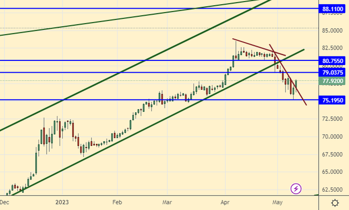 Fall scenario: after sales from 81.70, you need to keep short. The target at 73.00 remains on the radar.
