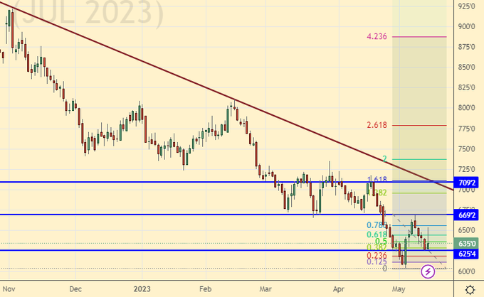 Growth scenario: we are considering the July futures, the expiration date is July 15. You have to stay long. In general, the positive report from the USDA did not make a big impression on the people. Everyone who wanted to sell did it before. Ripe growth.