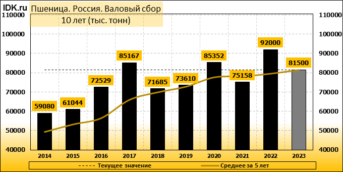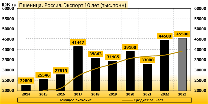 Валовый сбор: майская оценка сезона 23/24 составляет 81500 тысяч тонн. Потребление: оценивается в 41000 тысяч тонн. Экспорт: оценивается в 45500 тысяч тонн. Импорт: составит 300 тысяч тонн. Конечные запасы: составят 12938 тысяч тонн.