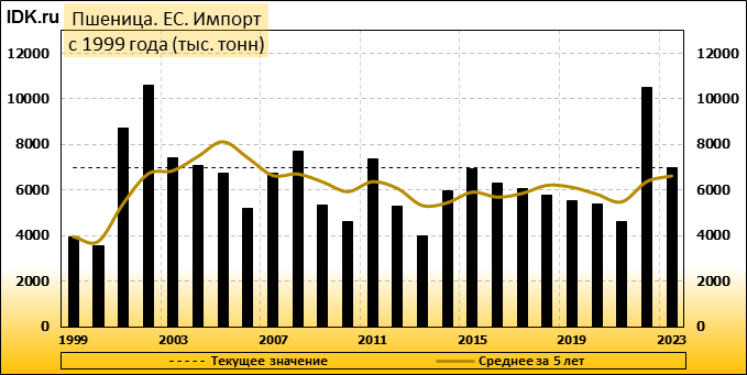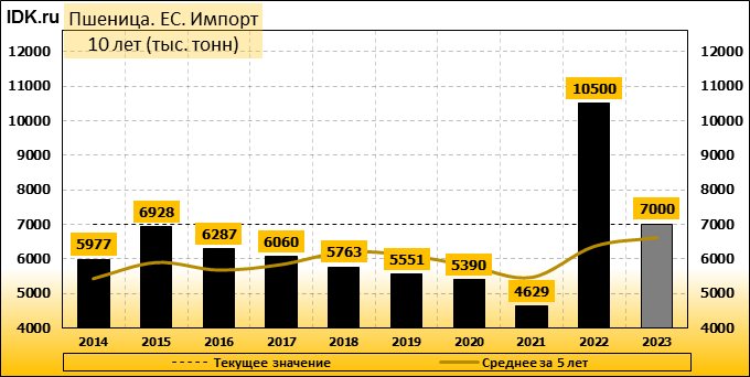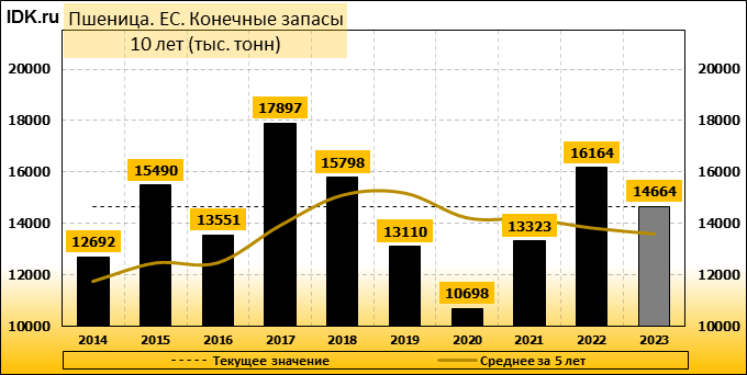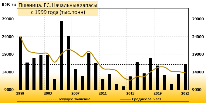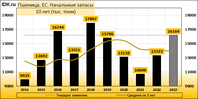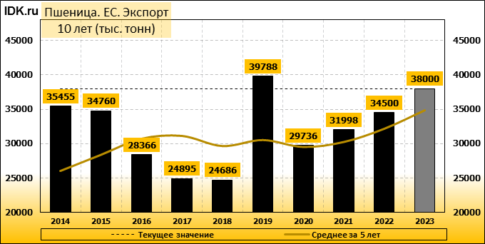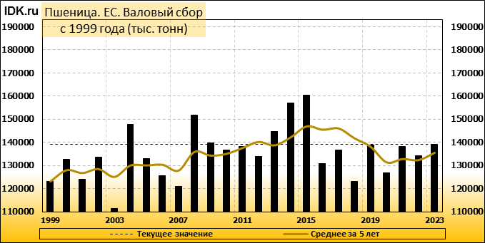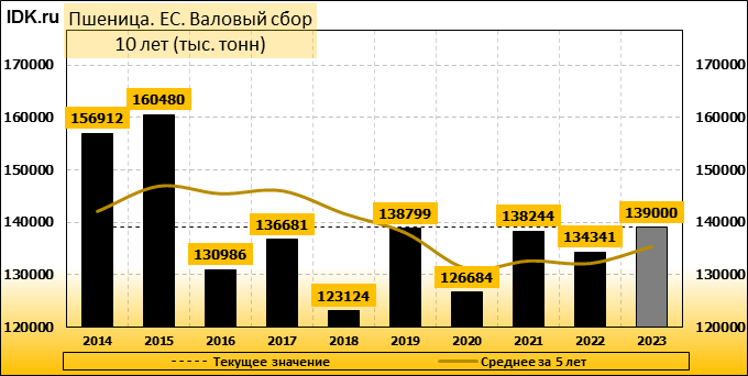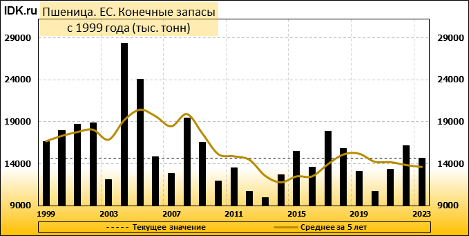 Валовый сбор: майская оценка сезона 23/24 составляет 139000 тысяч тонн. Потребление: оценивается в 109500 тысяч тонн. Экспорт: оценивается в 38000 тысяч тонн. Импорт: составит 7000 тысяч тонн. Конечные запасы: составят 14664 тысячи тонн.