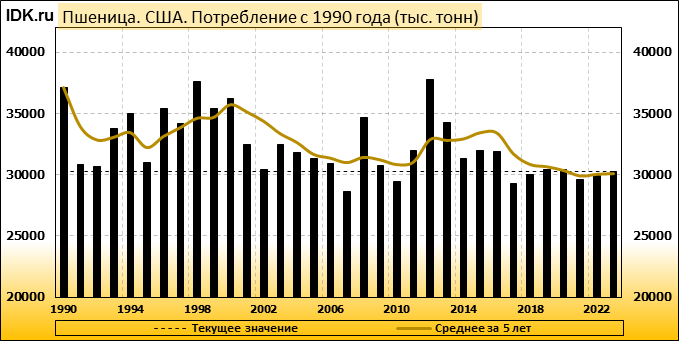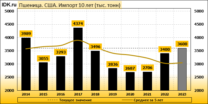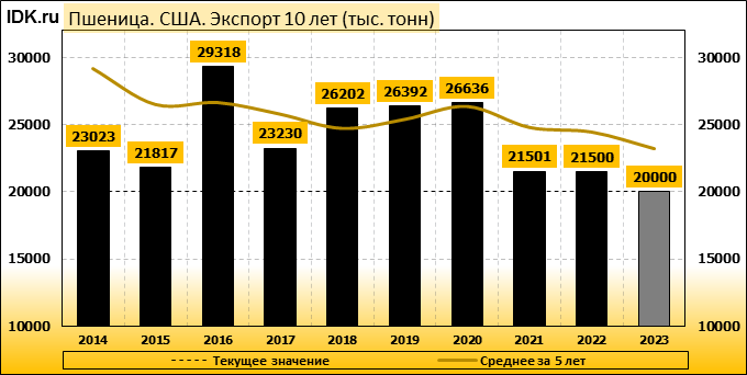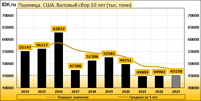 Группа мукомольных предприятий и продавцов пшеницы 25 апреля прогнозировала производство мягкой красной озимой пшеницы в США в 2023 году на уровне 404,923 млн бушелей, что на 68,297 млн бушелей, или 20%, по сравнению с 336,626 млн бушелей в 2022 году. Урожай мягкой красной озимой пшеницы, по прогнозам, будет самым большим с 2014 года, когда было собрано 454,531 млн бушелей, и вторым по величине после недавнего пика производства в 568,481 млн бушелей в 2013 году.