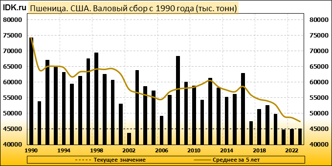 Эксперты также прогнозируют, что урожай мягкой белой озимой пшеницы, производимой в основном на северо-западе Тихого океана, составит 223,906 млн бушелей, что на 1,353 млн бушелей, или 1%, меньше, чем 225,259 млн бушелей в 2022 году.