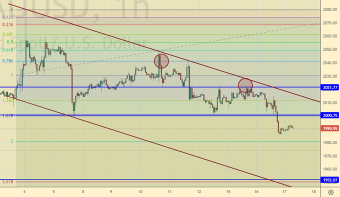 Показали новый локальный минимум. Идем вниз. На 1980 у нас случится первая остановка, после чего мы должны проходить к 1950, далее возможно 1875. Впереди лето. Политическая активность возможно будет снижена, станет меньше факторов способных дестабилизировать и без того шаткую ситуацию. Спрос на золото должен снизится.
