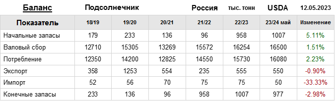 За прошедший месяц министерство сельского хозяйства США (USDA) на 12.05.2023 пересмотрело Баланс подсолнечника для России в сезоне 23/24 следующим образом: