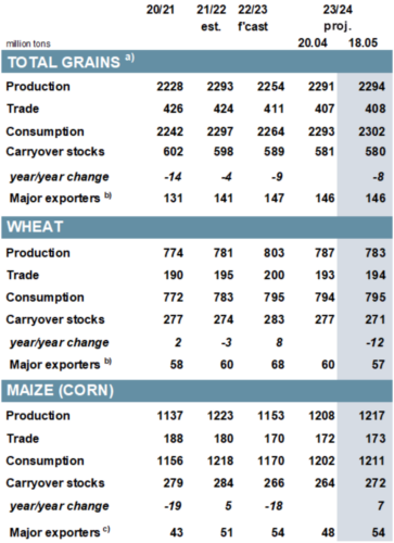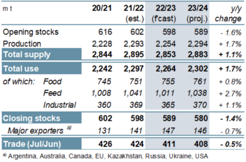 В основном из-за гораздо меньшего урожая кукурузы общий объем производства зерна (пшеницы и фуражного зерна) упал на 2% в 2022/23 году до 2 254 млн т, что стало первым сокращением в годовом исчислении за пять сезонов. Прогнозируется, что общее потребление снизится на 1%, в основном за счет использования более мягких кормов, а конечные запасы, по прогнозам, сократятся еще на 2%, что будет обусловлено снижением производства кукурузы. При 411 млн т общий объем торговли несколько выше среднего, но на 3% ниже г/г.