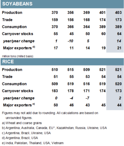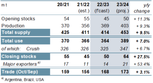 Мировое производство сои в 2022/23 году оценивается в 369 млн т (+4%), поскольку рекордный урожай в Бразилии более чем компенсирует падение в других странах. В связи с ожидаемым незначительным сокращением потребления запасы будут расти. Прогнозируется, что мировой спрос на импорт сильно увеличится за счет поставок в Аргентину и Азию. Прогнозируется, что мировой объем производства достигнет пика в 403 млн т (+9%) в 2023/24 г., при этом большая часть прироста в годовом исчислении будет связана с улучшением урожая в Южной Америке. Благодаря спросу на соевые продукты со стороны кормовой, пищевой и промышленной отраслей потребление выросло на 7% в годовом исчислении, в то время как запасы могут значительно увеличиться, в том числе в трех основных отраслях. Торговля прогнозируется на рекордных 173 млн т (+3%).