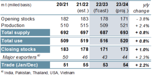 По оценкам, мировое производство риса сократилось на 1% в годовом исчислении в 2022/23 году. Несмотря на умеренное снижение использования, запасы, по прогнозам, сократятся на 7 млн т в год, включая уменьшение запасов экспортеров. В связи со снижением спроса со стороны импортеров, особенно в Азии, ожидается, что торговля в 2023 году снизится на 5% в годовом исчислении до 53 млн тонн. На фоне ожиданий увеличения посевных площадей и повышения урожайности прогнозируется устойчивый рост производства в 2023/24 году до 521 млн т (+2%), при этом прогнозируется скромный рост потребления и запасов. Торговля может восстановиться в 2024 году за счет африканских покупок.