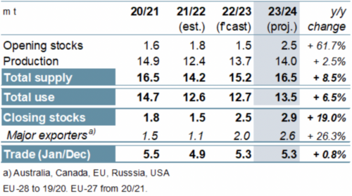 Прогнозируется, что мировое производство зерна восстановится до рекордных 2 294 млн тонн в 2023/24 году. Ожидается, что урожай кукурузы и сорго будет выше, в то время как урожай пшеницы и ячменя может снизиться. На фоне роста кормов, продуктов питания и промышленного использования общее потребление, по прогнозам, достигнет 2 302 млн т (+2%), что приведет к дальнейшему сокращению запасов в конце сезона до 580 млн т (-1%), что может стать самым низким показателем за девять лет. Ожидается, что торговля, ограниченная меньшими отгрузками пшеницы, снова сократится до 408 млн тонн.
