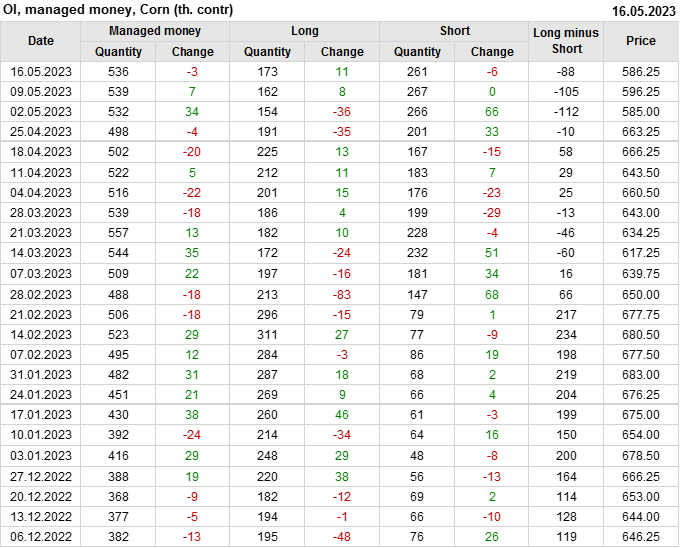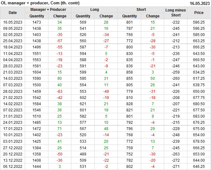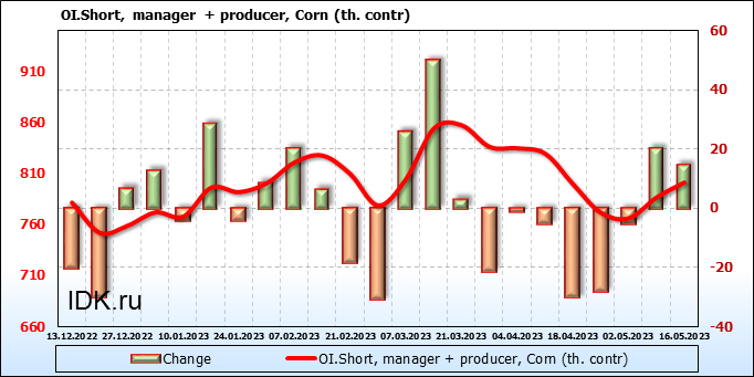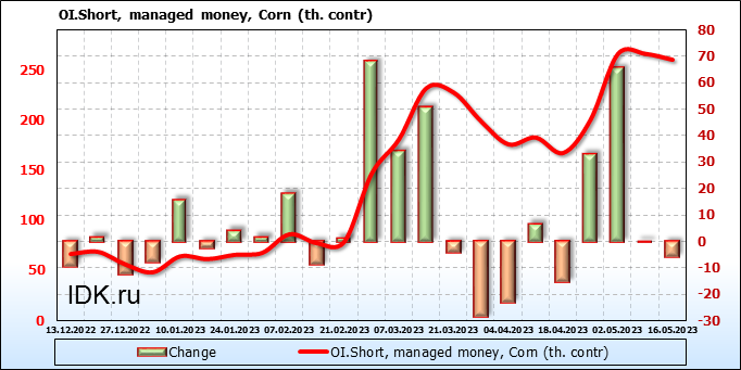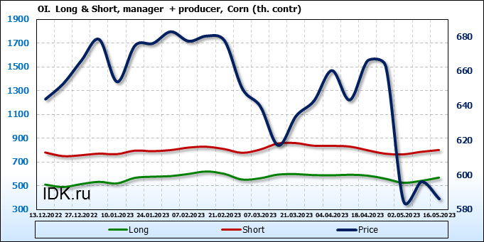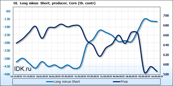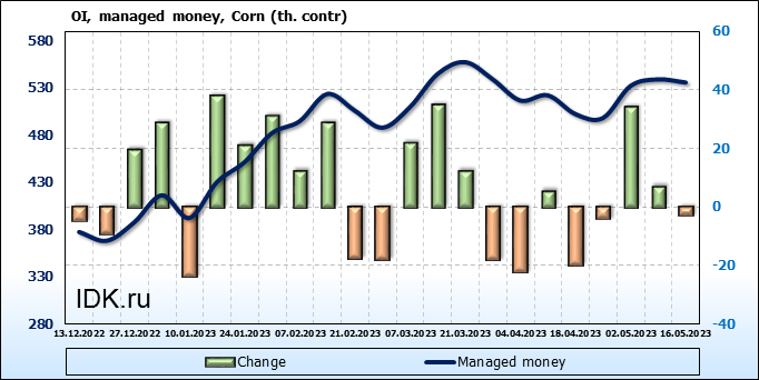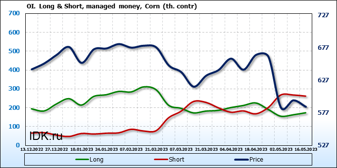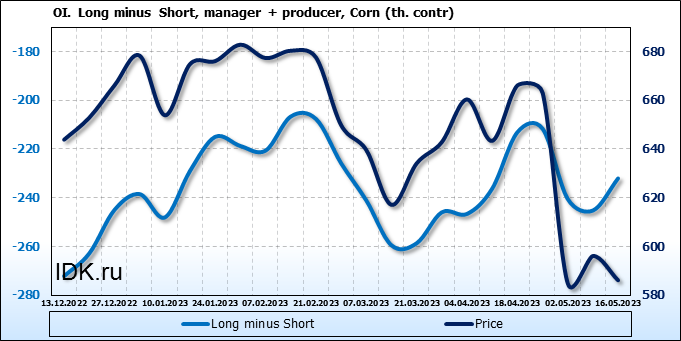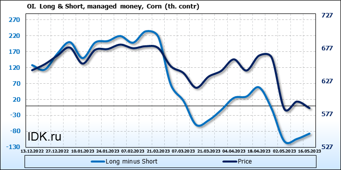 За прошлую неделю, 10.05.23 — 16.05.23, разница между длинными и короткими позициями управляющих сократилась на 16.8 тыс. контрактов. В тоже время, цена упала на 10 центов.