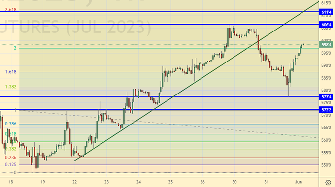 Пшеница (июльский контракт, CME Group, исполнение 14.07.2023)