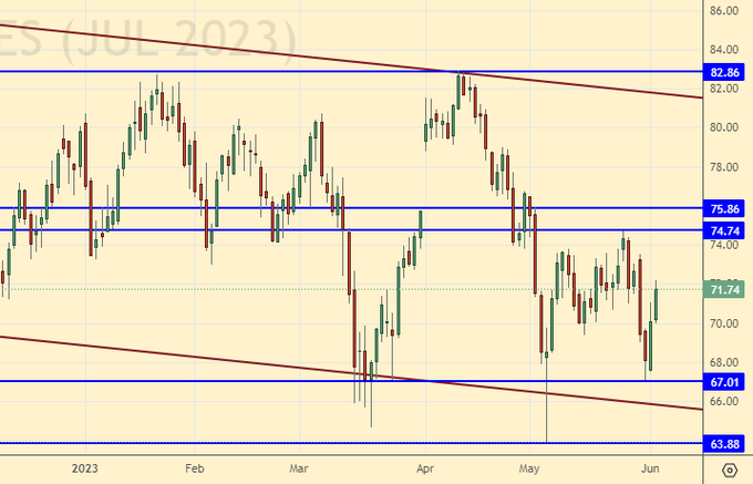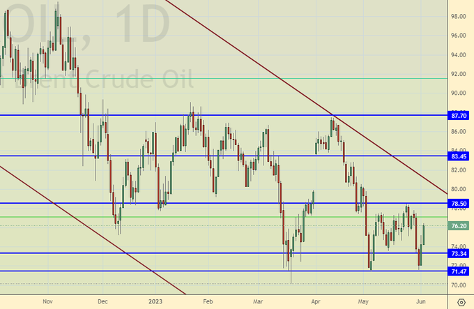 The Americans finally agreed on a ceiling on the national debt, which relieved tension in the markets. Oil should have received a positive boost from what happened, but it looks like it will start to rise only after OPEC cuts in production. As of Sunday evening, there are rumors that the cartel’s production will be cut by 1 million bpd.