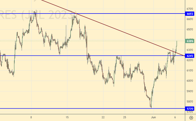 Пока быки держатся, однако настроения может изменить прогноз по валовому сбору от USDA, который выйдет 9 июня в пятницу. Мы пока не видим сообщений о том, что погода наносит ущерб кукурузе, что означает сохранение нормальных темпов созревания урожая.