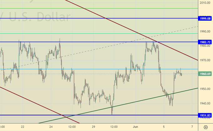 Рынок способен пройти к 2000. Если это произойдет, то продавать обязательно. До заседаний Центральных Банков по ставкам 14-го и 15-го числа, золото вряд ли сменит понижательный тренд на растущий. Поэтому рост рынка до заседания – это блеф. При этом мы не отрицаем продолжения восходящего движения в среднесрочной перспективе.