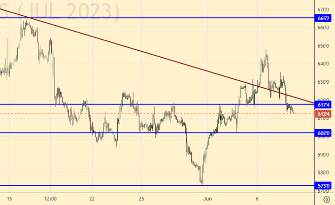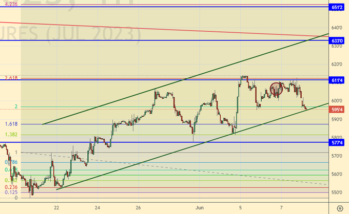 Неспособность взять 610.0 приводит к тому, что у нас намечается разворот. Рост цен на кукурузу без роста цен на пшеницу вызывал серьезные вопросы у нас, и не исключено, что наконец мы увидим восстановление спреда между культурами. Напомним, что на моменте он был нулевым.