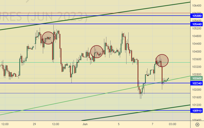 Продавцам надо проталкивать рынок ниже 100000, это событие будет иметь психологический эффект, который может привести к началу распродаж. Отметим, что Сбербанк пока смотрится неплохо. Резкого отката вниз не случилось. Голубым фишкам стоит лишь найти немного денег для поддержания собственных акций, и на фондовом рынке будет такая же идеальная картина, как и на рынке США, где крупные компании, просто выкупают свои же бумаги, не давая падать котировкам. Всё хорошо.