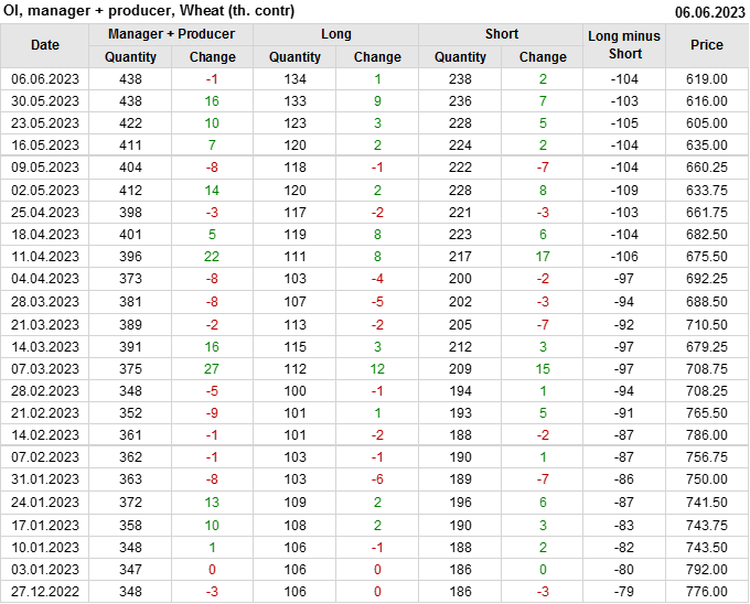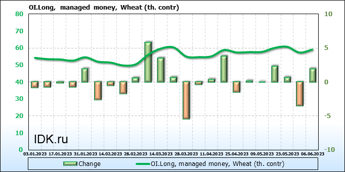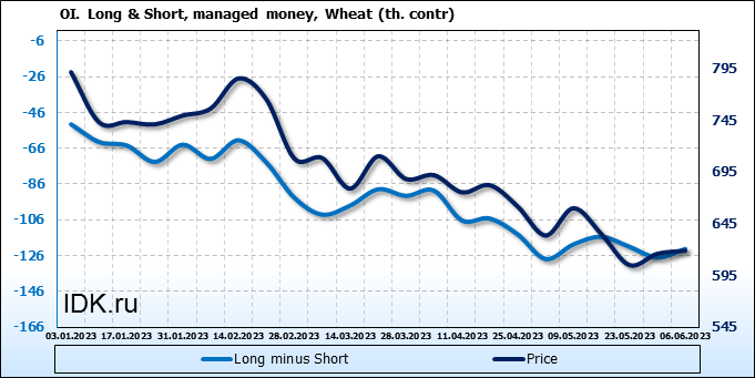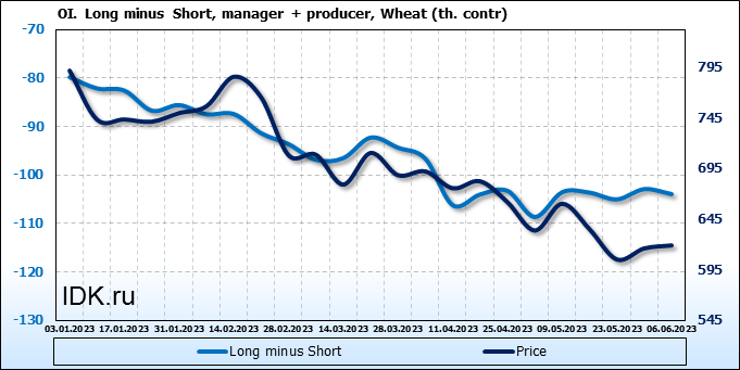 За прошедшую неделю, 31.05.23 — 06.06.23, разница между длинными и короткими позициями управляющих сократилась на 4.8 тыс. контрактов. В тоже время, цена выросла на 3 цента.