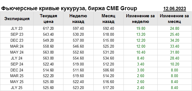На 12.06.2023 стоимость кукурузы на бирже CME Group по контракту JLY 23 составила 617.2 цента за бушель. За прошедшую неделю стоимость кукурузы на площадке CME Group выросла на 19.8 цента/бушель. Как мы видим на графике, фьючерсная кривая имеет периоды, когда более дальний фьючерс дешевле ближнего. Состояние бэквардации наблюдаем на следующих контрактах: SEP 23; SEP 24; DEC 24. Таким образом, трейдеры предполагают, что возможно превалирование предложения над спросом в указанные периоды.