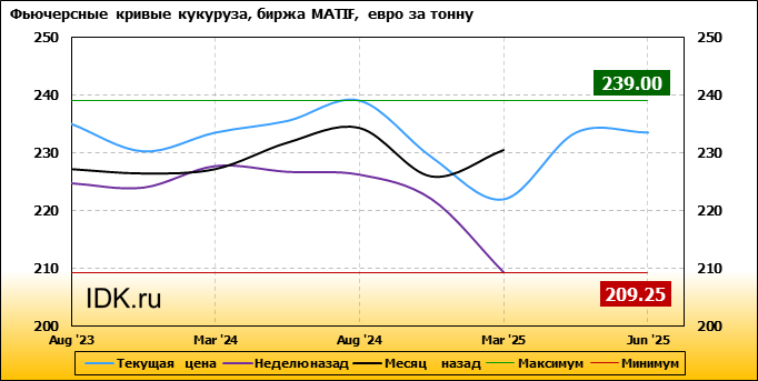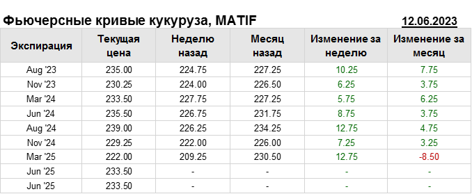 На 12.06.2023 стоимость кукурузы на бирже MATIF по контракту Aug ’23 составила 235 евро за тонну. За прошедшую неделю стоимость кукурузы на европейской площадке выросла на 10.25 евро/тонна. Как мы видим на графике, фьючерсная кривая имеет периоды, когда более дальний фьючерс дешевле ближнего. Состояние бэквардации наблюдаем на следующих контрактах: Nov ’23; Nov ’24; Mar ’25. Таким образом, трейдеры предполагают, что возможно превалирование предложения над спросом в указанные периоды.