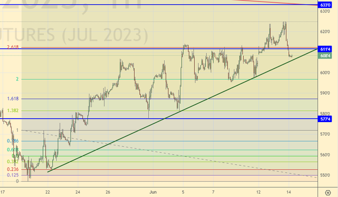 Видим атаку продавцов от 625.0. Кукуруза должна присесть. Но произойдет это только тогда, когда быки осознают, что её будет море. А будет именно так, и для того, чтобы не нарваться на резкое падение многие предпочтут разгрузить свои бычьи позиции заранее.