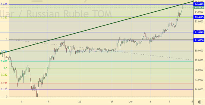 Пара достигла бычьих промежуточных целей. Не исключено, что на сегодня будет взята пауза, однако, не исключено, что идея о том, что доллар должен в среднем стоить 100 рублей поселилась в чьих-то головах. По технике мы должны остановиться на 90.00, но кроме техники есть еще и ручное управление, которое может привести нас к более высоким котировкам.