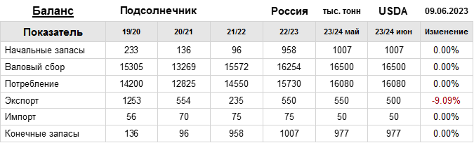 За прошедший месяц министерство сельского хозяйства США (USDA) на 09.06.2023 пересмотрело Баланс подсолнечника для России в сезоне 23/24 следующим образом: