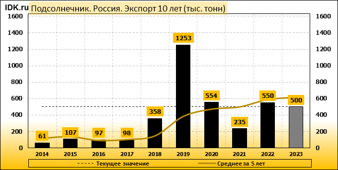 Экспорт: оценивается в 500 тысяч тонн. За месяц показатель упал на -9.09 процента.