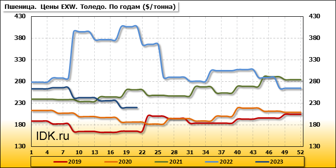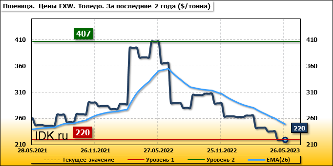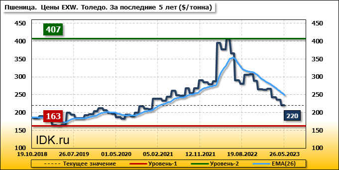 Внутренние цены на пшеницу SRW в городе Толедо (США) упали на 15.8 $/т. и на отчетный месяц составляют 220.06 доллара за тонну.