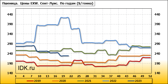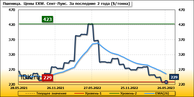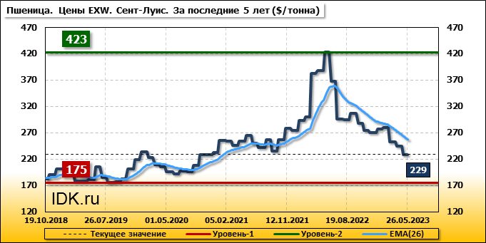 За прошедший месяц внутренние цены на пшеницу SRW в Сент-Луисе (США) упали на 15.5 $/т. и на отчетный месяц составляют 228.9 доллара за тонну.