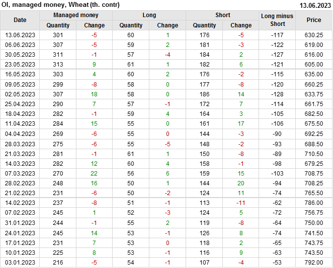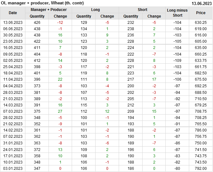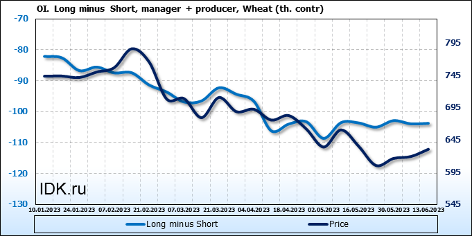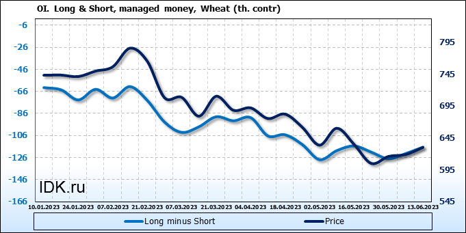 За прошедшую неделю, 07.06.23 — 13.06.23, разница между длинными и короткими позициями управляющих сократилась на 5.7 тыс. контрактов. В тоже время, цена выросла на 11.25 цента.