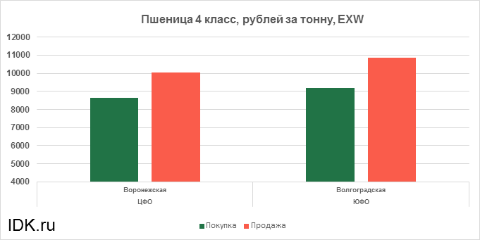 За прошедшую неделю с 12.06.2023 по 16.06.2023 средняя цена на пшеницу 4-го класса, согласно выставленным заявкам трейдеров, упала по всем округам на 82 рубля. Средняя цена составляет 9687 рублей за тонну.