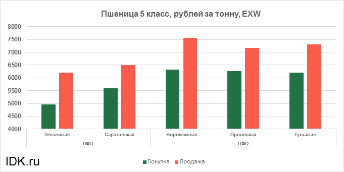 За прошедшую неделю с 12.06.2023 по 16.06.2023 средняя цена на пшеницу 5-го класса, согласно выставленным заявкам трейдеров, упала по всем округам на 473 рубля. Средняя цена составляет 6310 рублей за тонну.