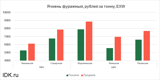 За прошедшую неделю с 12.06.2023 по 16.06.2023 средняя цена на фуражный ячмень, согласно выставленным заявкам трейдеров, упала по всем округам на 495 рублей. Средняя цена составляет 6746 рублей за тонну.