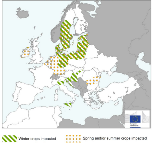 Солнечные и засушливые условия на значительной части северо-западной, северной и северно-центральной Европы привели к быстрому истощению запасов влаги в почве, что отрицательно сказалось на потенциальной урожайности озимых и яровых культур. Явный избыток осадков в южных и северных частях Италии, Венгрии, Хорватии и Словении привел к заболачиванию, затоплению территорий и усилению нашествия вредителей, что оказало негативное воздействие (полные потери в затопленных районах) на озимые культуры.