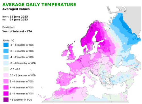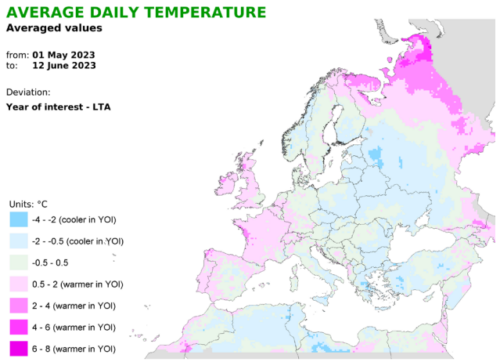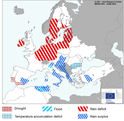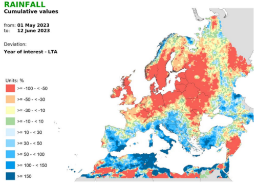 В Ирландии, странах Балтийского моря и Польше, а также во многих регионах восточной Германии дефицит осадков после задержки с посевом, о которой сообщалось в бюллетене за май 2023 года, вызвал беспокойство как в отношении озимых, так и яровых культур. В странах Бенилюкса и большей части западной и южной Германии больше всего страдают яровые культуры; особенно картофель. В северной Франции, несмотря на дефицит осадков, на данном этапе нет непосредственных опасений по поводу развития сельскохозяйственных культур.