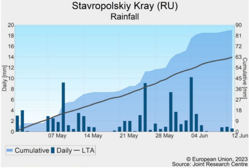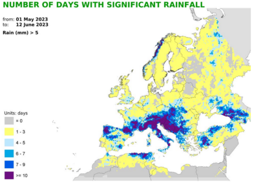 В пострадавшем от наводнения регионе Эмилия-Романья, Италия, как сообщалось в бюллетене за май 2023 года, дальнейшие избыточные дожди в начале июня, в том числе на Сицилии, усугубили негативное воздействие на озимые. В некоторых частях Словакии, Венгрии и большей части Хорватии и Словении избыток осадков вызвал усиление нашествия вредителей. В Северной Африке (Тунис и Алжир) количество осадков, превышающее LTA на 100 % и более, привело к сильным наводнениям.