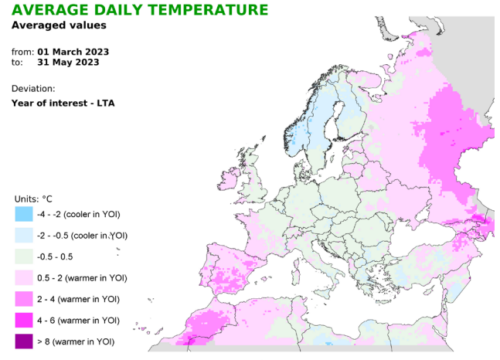 Более теплые, чем обычно, условия со среднесуточной температурой от 2°C до 4°C выше долгосрочного среднего значения (LTA) за 1991–2022 гг. наблюдались на севере европейской части России и на небольших территориях в западной Франции, северо-западе Пиренейского полуострова, Ирландии и Шотландии. Это отражается в суммах температур (Tbase = 0°C), превышающих LTA на 100°Cd и более. Менее отчетливые положительные аномалии наблюдались в некоторых частях Пиренейского полуострова, большей части Франции, граничащих с северной Италией, Австрией и Германией, а также в большинстве стран Бенилюкса, Ирландии и Соединенном Королевстве.