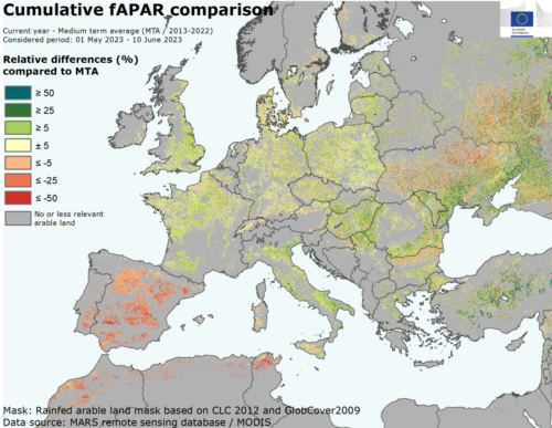 На карте показаны относительные различия (в процентах) между кумулятивной долей поглощенной фотосинтетически активной радиации (fAPAR) с 1 мая по 10 июня 2023 г. и среднесрочным средним значением (MTA, 2013–2022 гг.) за тот же период. Положительные аномалии (зеленые) отражают биомассу выше среднего или раннее развитие урожая, тогда как отрицательные аномалии (красные) отражают биомассу ниже среднего или позднее развитие урожая.