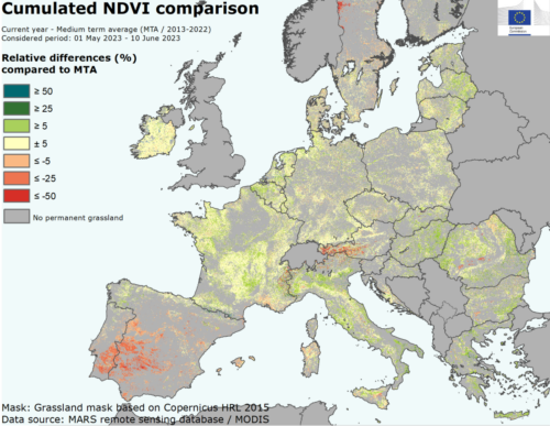 На приведенной ниже карте показаны различия между нормализованным разностным вегетационным индексом (NDVI), накопленным с 1 мая по 10 июня 2023 г., и среднесрочным средним значением (MTA, 2013–2022 гг.) за тот же период. Положительные аномалии (зеленый цвет) отражают уровень зелени поверхности выше среднего, а отрицательные аномалии (красный цвет) отражают уровень зелени поверхности ниже среднего. Резко контрастирующие красные цвета во французских и австрийских Альпах, а также в горных районах центральной Румынии вызваны поздним выпадением снега и/или высокой облачностью. В этот период года состояние кормовых культур еще не может быть оценено.