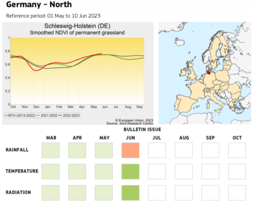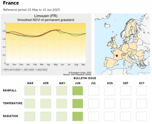 Во Франции благоприятные условия отмечаются на большей части территории страны, за исключением некоторых регионов на юге (долина Роны, PACA и регионы Средиземноморья), где продуктивность пастбищ была ниже средней из-за более засушливых, чем обычно, условий в апреле. В Нидерландах, Бельгии и Люксембурге после 2 месяцев обильных дождей сухая и солнечная погода со второй недели мая способствовала росту пастбищ. Однако запасы влаги в почве истощились, особенно после резкого повышения температуры в июне. Дождь необходим срочно, и многие фермеры уже начали орошать пастбища.