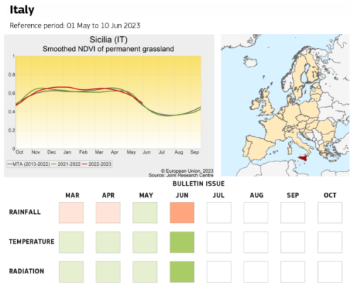 В Италии чрезмерные осадки с начала мая замедлили накопление биомассы пастбищ и кормов, особенно на юге Италии, в Сардинии и Эмилии-Романье. В последнем районе аномальные паводки произошли 16 мая 2010 года. Урожаю кормовых культур на Сицилии мешали сильные ветра (60-100 км/ч) вкупе со штормами в середине июня. Общее формирование биомассы пастбищ и кормов в Италии колеблется от уровня среднего сезона до уровня ниже среднего. В Греции количество осадков выше среднего и сезонные температуры способствовали хорошему прогрессу накопления биомассы на пастбищах в период с мая по июнь.