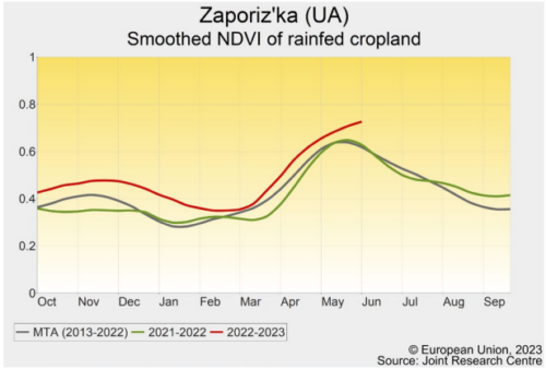 Конец весны характеризовался более сухими, чем обычно, условиями, но без истощения почвенной влаги ниже критического уровня. Озимые культуры выиграли от отсутствия термического стресса в течение рассматриваемого периода, что обеспечило благоприятные условия во время цветения и раннего налива зерна.